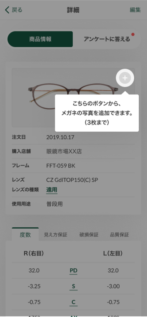 お受け取り日・購入店舗・フレーム・レンズ・レンズの種類・使用用途・度数・見え方保証・破損保証・品質保証について確認することができます。