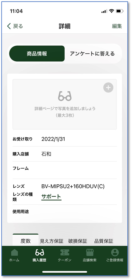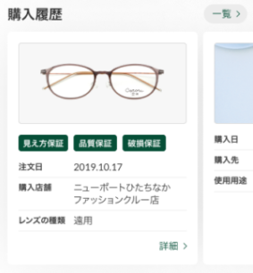 お受け取り日・購入店舗・フレーム・レンズ・レンズの種類・使用用途・度数・見え方保証・破損保証・品質保証について確認することができます。