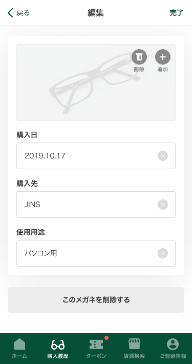 各項目を入力後「登録する」ボタンをタップで、メガネが購入履歴に追加されます。