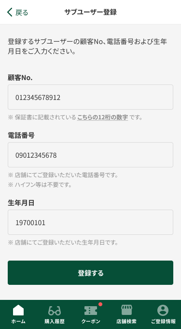 登録するサブユーザーの「顧客No.」「電話番号」「生年月日」を入力します。