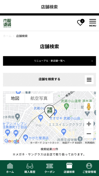 フッターの「店舗検索」をタップすると、店舗検索ページが表示されます。