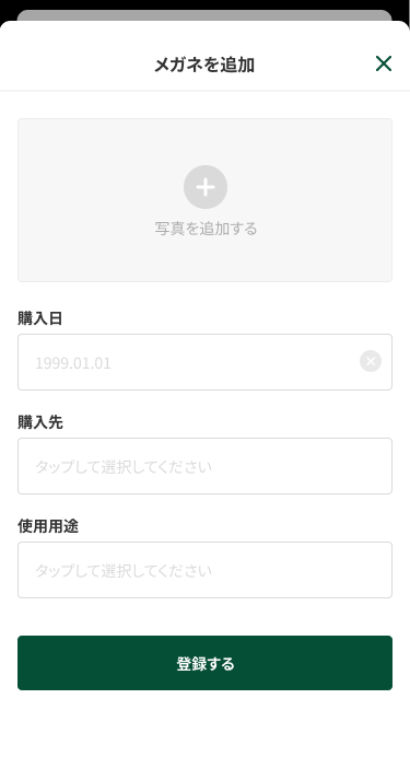 各項目を入力後「登録する」ボタンをタップで、メガネが購入履歴に追加されます。