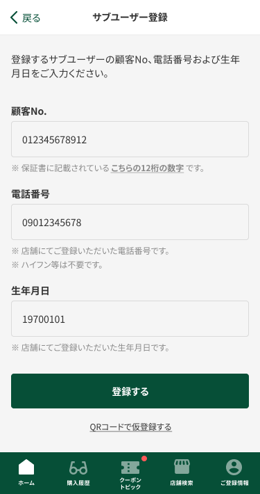 登録するサブユーザーの「顧客No.」「電話番号」「生年月日」を入力します。