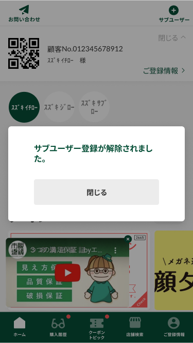 この場合、サブユーザー名のアイコンをタップすると、「サブユーザー登録が解除されました」のダイアログが表示された後、該当のサブユーザーアイコンの表示はスタートページから削除されます。